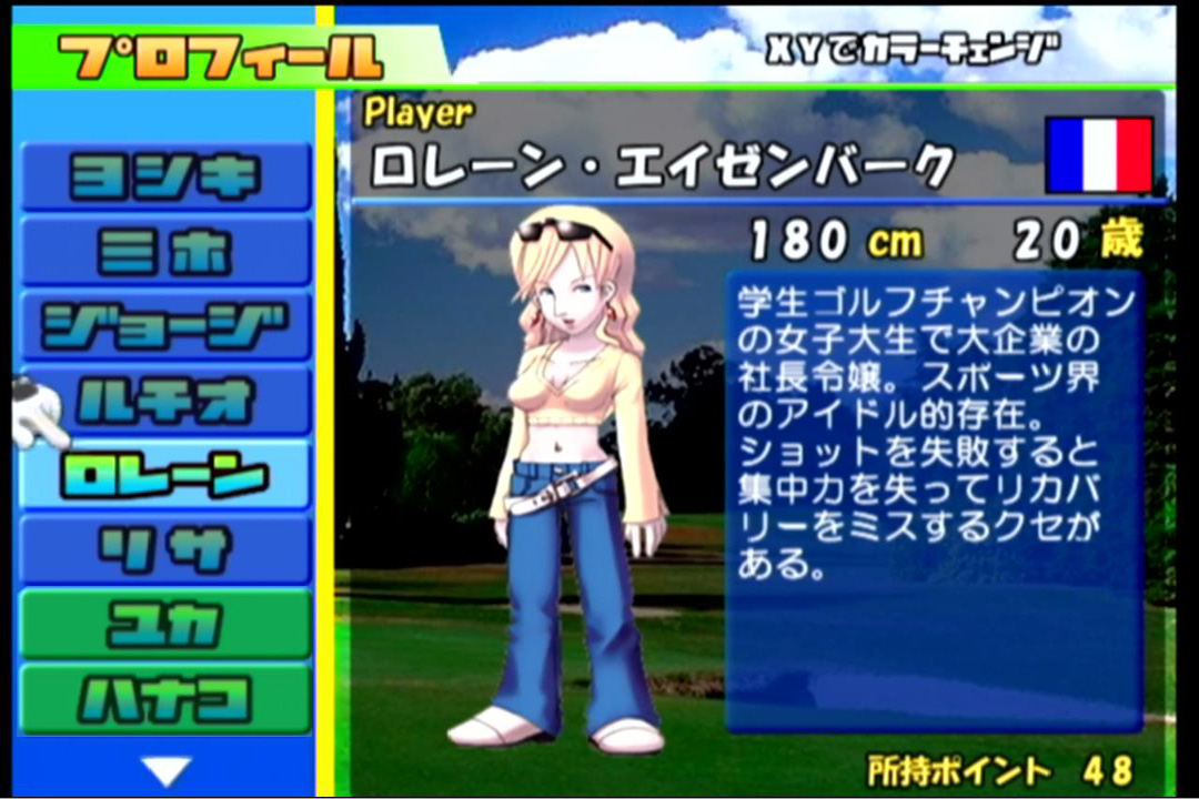 近日おじゃまします^^わいわいゴルフのロレーンは再現できますか?私はわいわいゴルフは一切やった事ないですが記事は見て知りました容姿とプライドの高いお嬢様というプロフィール設定で彼女が気に入ったのでマイキャラを17人→22人と5人拡張してみんゴル2のマヤとリョウと共に作りたいと思いました^^(ただし事情あってマヤとリョウとロレーンは8月以降に作る予定です^^後の2人は未定です)