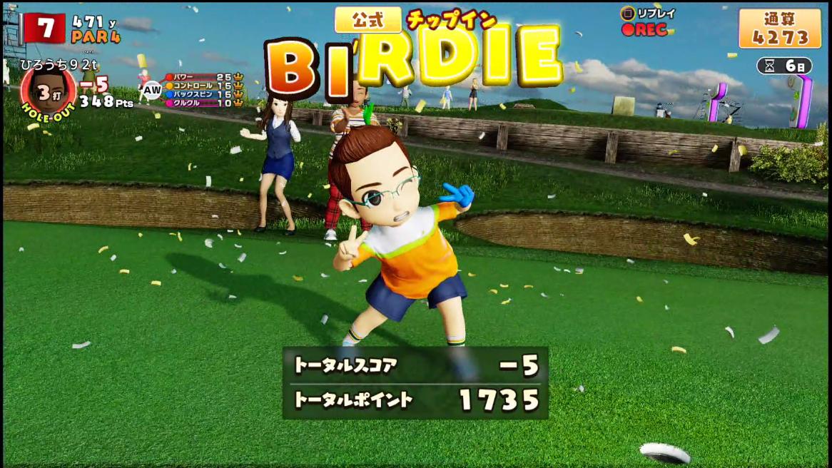7番は2オン逃しつつもカラーからチップインさせて無事にバーディ!