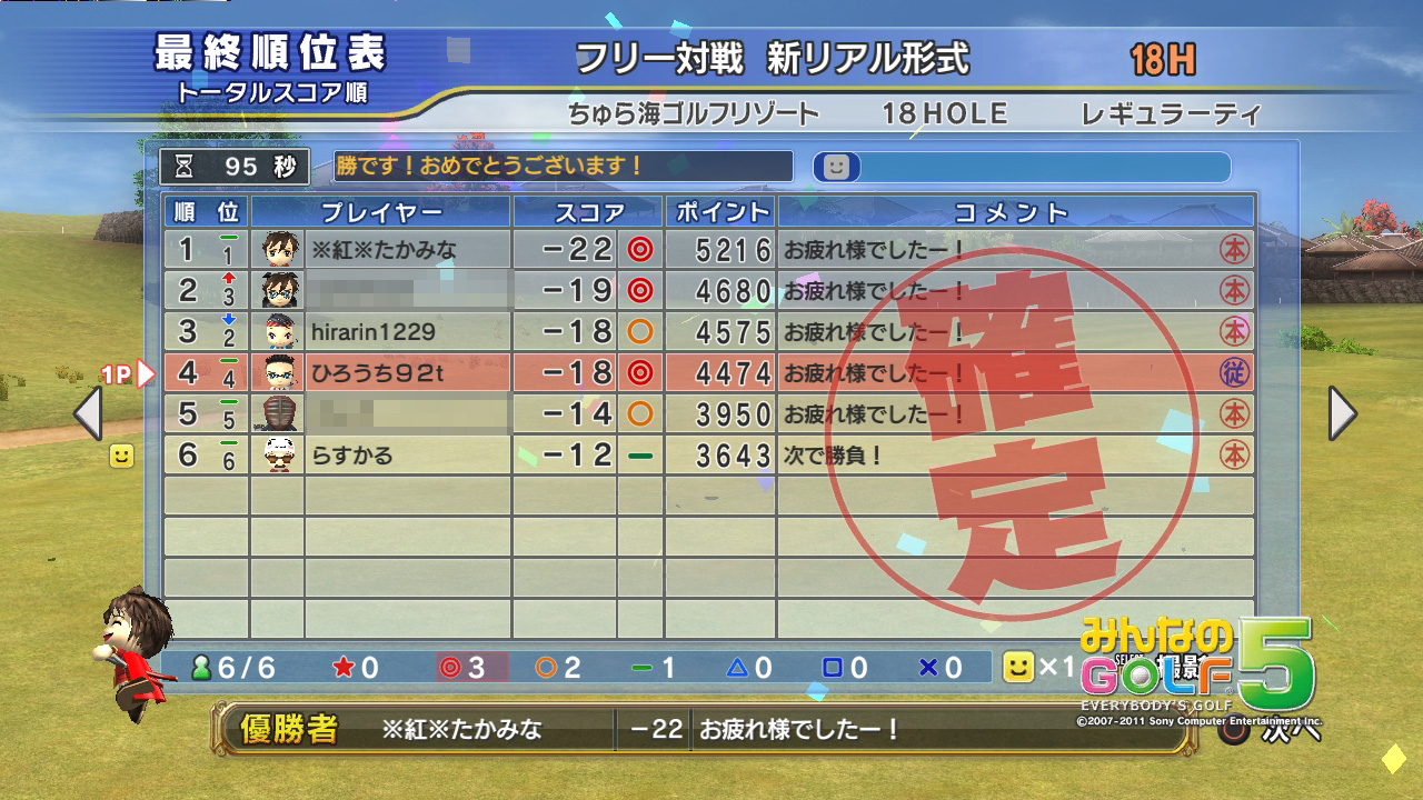 | 6位 | hirarin1229 | リタイア(ちゅら18) | -19:-18:×:× |