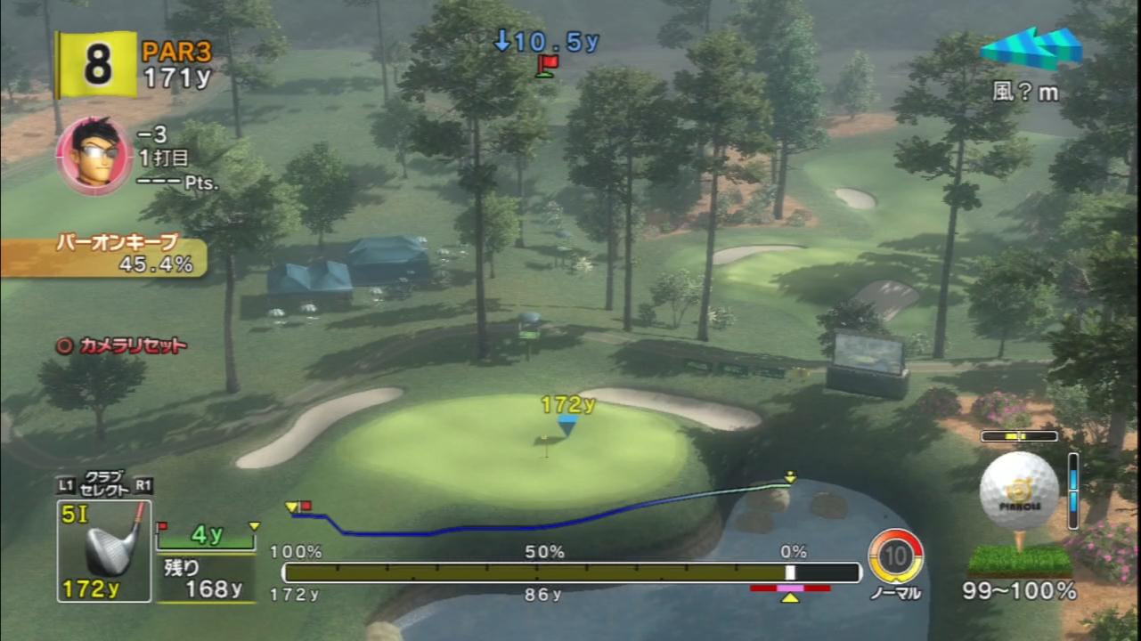 ↑ グリーンはそのほとんどがハザードに面しており、スピン能力が低いとそれだけ不利だった