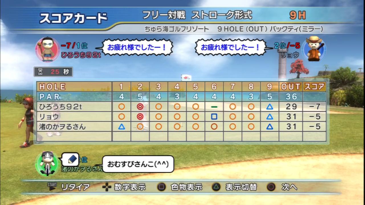 | ● 【ストローク】ちゅら(ミラー) OUT ● バンカー+2 |  |  | ひろうち92t / ユキノ | 従ビグイン | | ○ | ◎ | ○ | ○ | ○ | − | ○ | ○ | △ | −7 | | | | | | | | | | 1位/3人 |  |  | 渚のかヲるさん / ユキノ | 従インイン | | △ | ○ | ○ | ○ | ○ | ○ | ○ | ○ | △ | −5 | | | | | | | | | | 2位/3人 |  |  | リョウ / ユキノ | 従マグイン | | ○ | ◎ | ○ | ○ | ○ | □ | ○ | ○ | △ | −5 | | | | | | | | | | 2位/3人 |