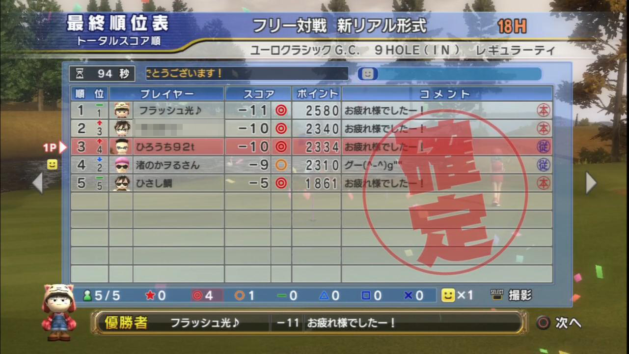 | ● 【新リアル】ユーロ IN ● バンカー+2 |  |  | フラッシュ光♪ / ティアナ | 本タボイン | | | | | | | | | | −11 | | ○ | ◎ | ○ | ○ | ○ | ○ | ○ | ○ | ◎ | 1位/5人 |  |  | ひろうち92t / ティアナ | 従ビギグラ | | | | | | | | | | −10 | | ○ | ◎ | ○ | ○ | − | ○ | ○ | ○ | ◎ | 3位/5人 |  |  | 渚のかヲるさん / クレイトス | 従インイン | | | | | | | | | | −9 | | ○ | ◎ | ○ | − | ○ | ○ | ○ | ○ | ○ | 4位/5人 |  |  | ひさし鯛 / グロリア | 本インイン | | | | | | | | | | −5 | | ◎ | − | − | − | ○ | − | − | − | ◎ | 5位/5人 |