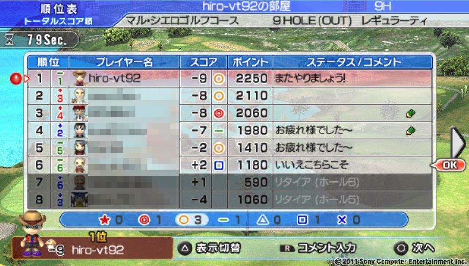 | ● 【GF】メープル 18H ● 上級限定 |  |  | hiro-vt92 / マックス | ドコタボ | | ◎ | ○ | ◎ | ○ | ○ | ○ | ○ | ○ | ○ | −20 | | ○ | ◎ | − | ○ | ○ | ○ | ○ | ○ | ○ | 3位/28人 |