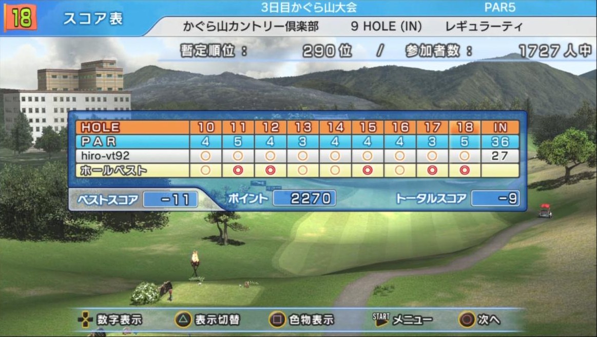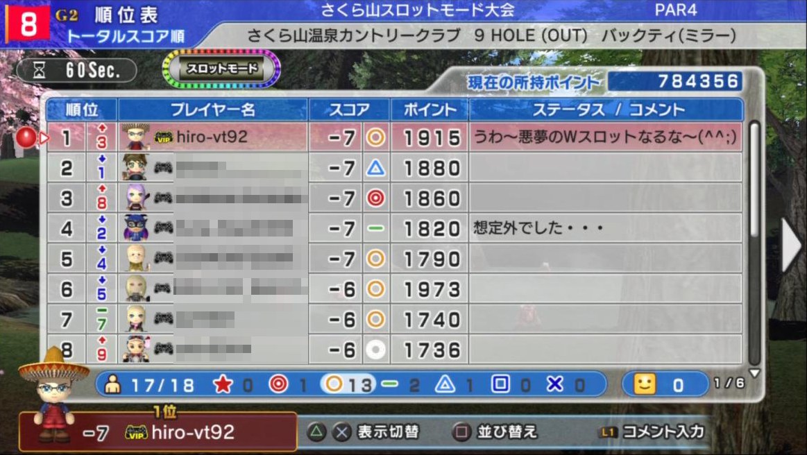 | ● 【G2】ノーザン OUT ● 木で+1打 |  |  | hiro-vt92 / キトゥン | ドコビグ | | ○ | ○ | △ | ○ | ○ | ○ | ◎ | ○ | ○ | −8 | | | | | | | | | | 13位/35人 |