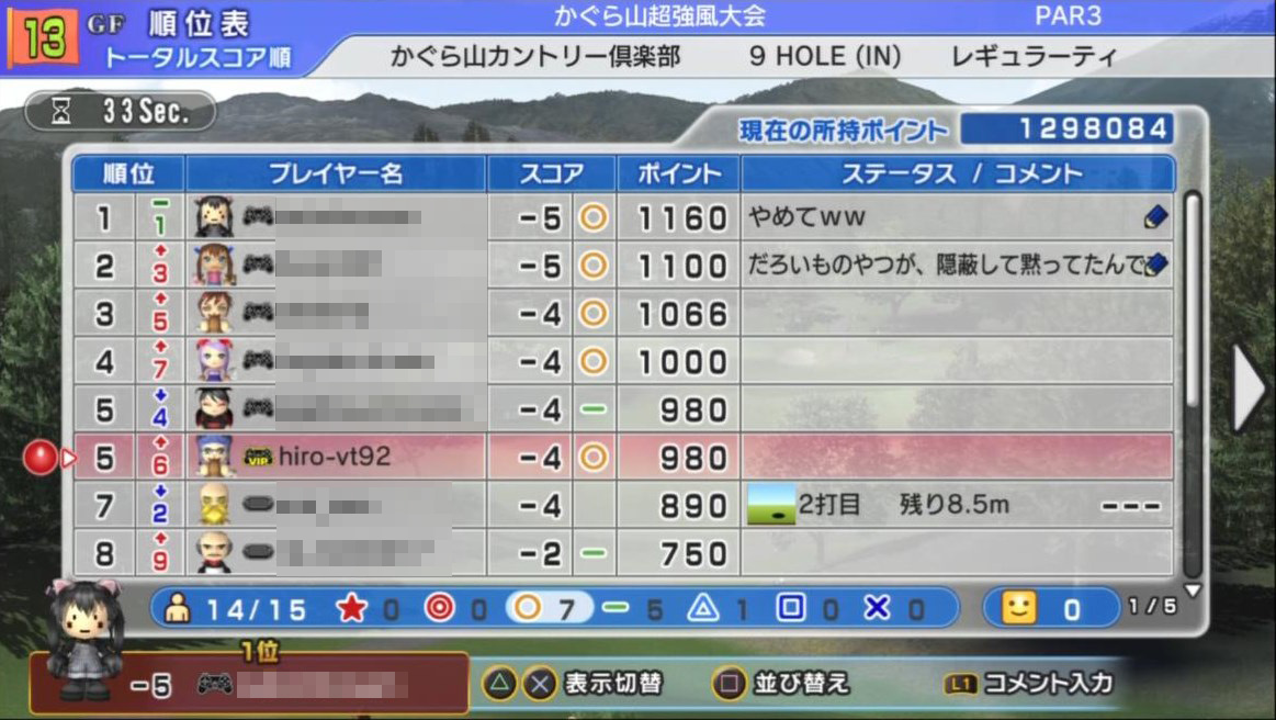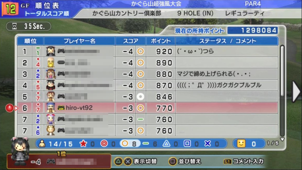 | ● 【GF】かぐら山(ミラー) IN ● 超強風大会 |  |  | hiro-vt92 / アイザック | ドコビグ | | | | | | | | | | −7 | | ○ | ○ | ○ | ○ | − | ○ | ○ | − | ○ | 4位/15人 |