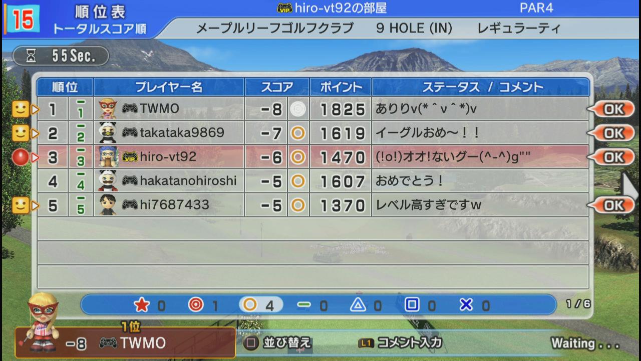 15番ではパパさんがロングチップインでイーグルを決め、トップが交代。