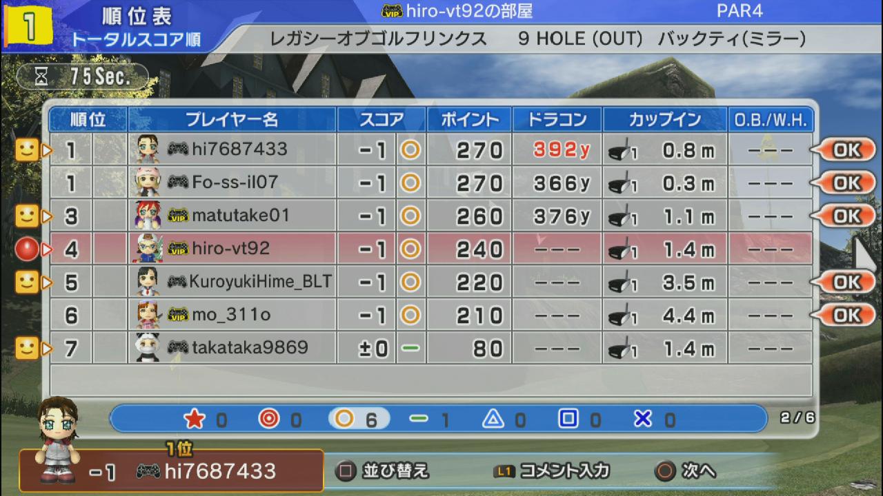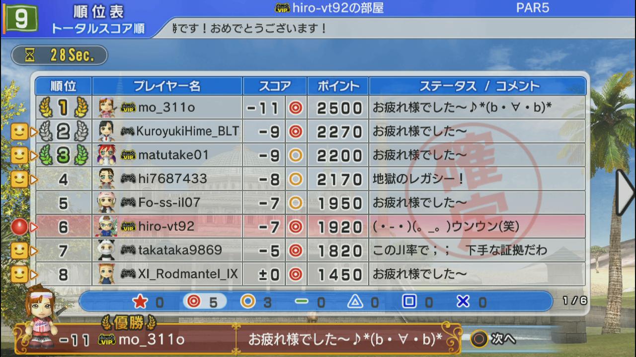 | 4位 |  | ryo (ryo2011station) | 1P | 出だしが悪く、最後だけイーグルが取れました。どもぉです |
