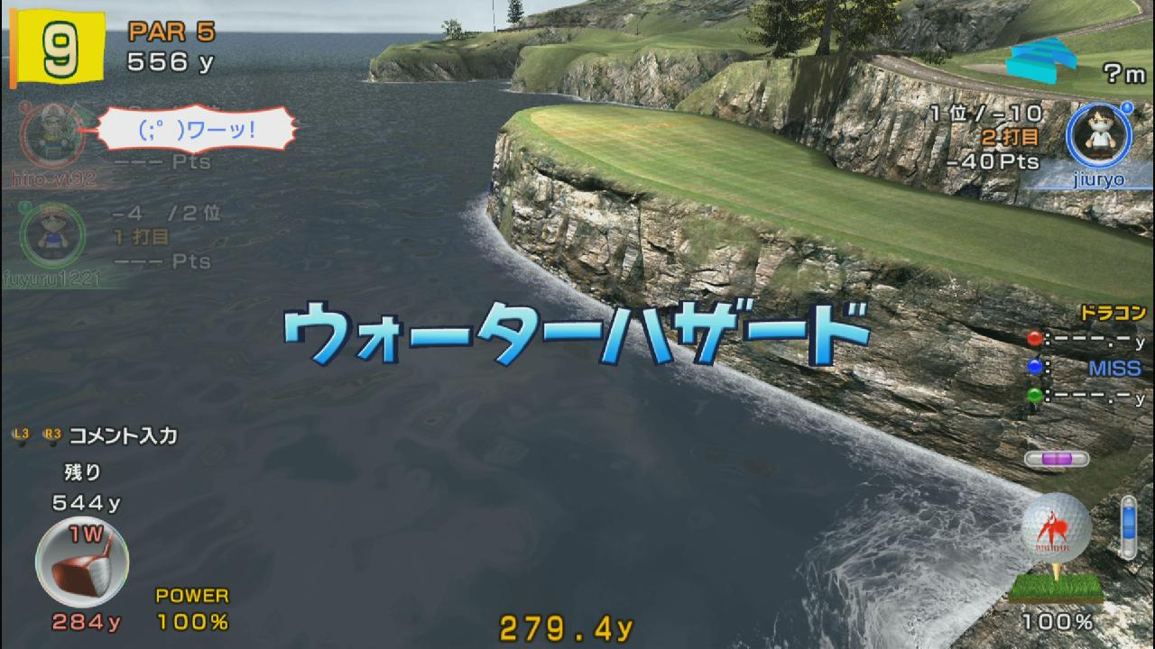 フェアウェイの細長い島を捉えられずに海にダイブ…