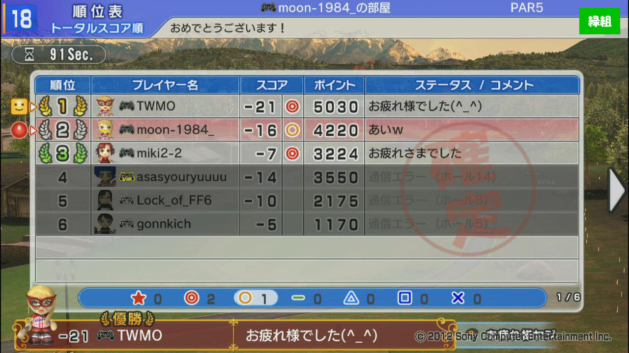 ひろうち92tトップ > みんゴル日誌 > みんゴル6 > 対戦部屋記録 2014年8月11日号
