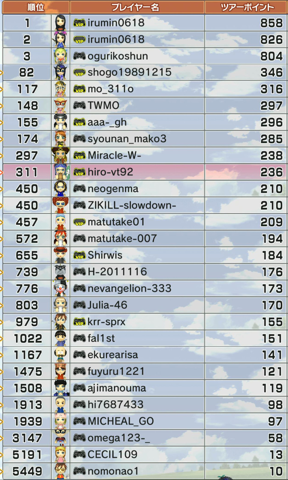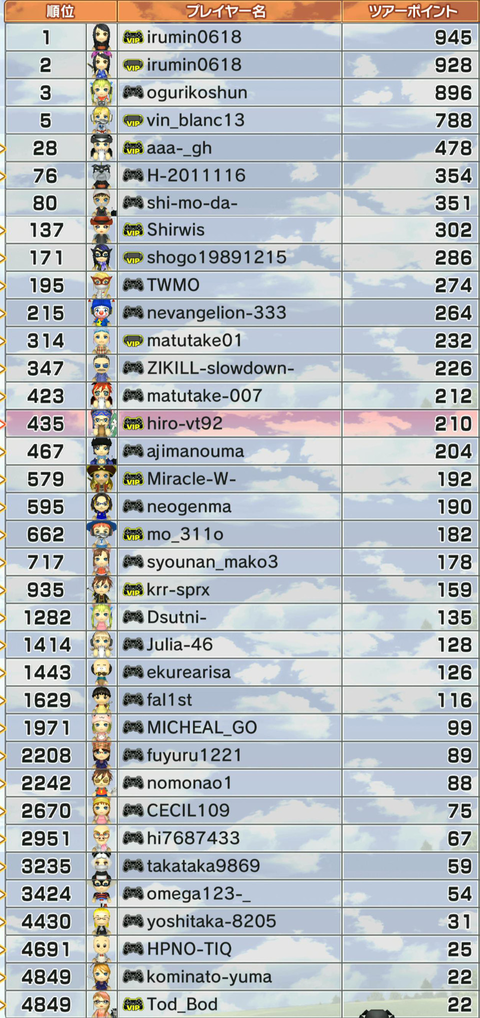 あとは、珍しく疾風君やさきさん、shogoさんがひろうち92tの下の順位にいます