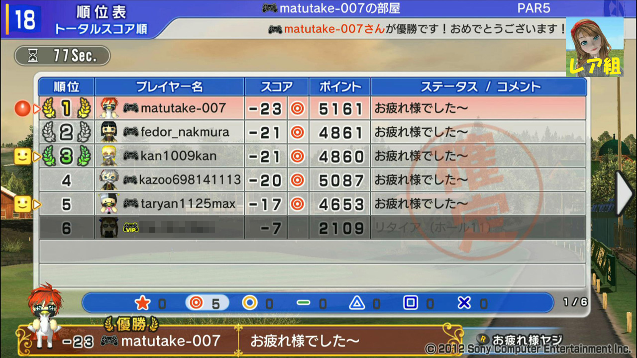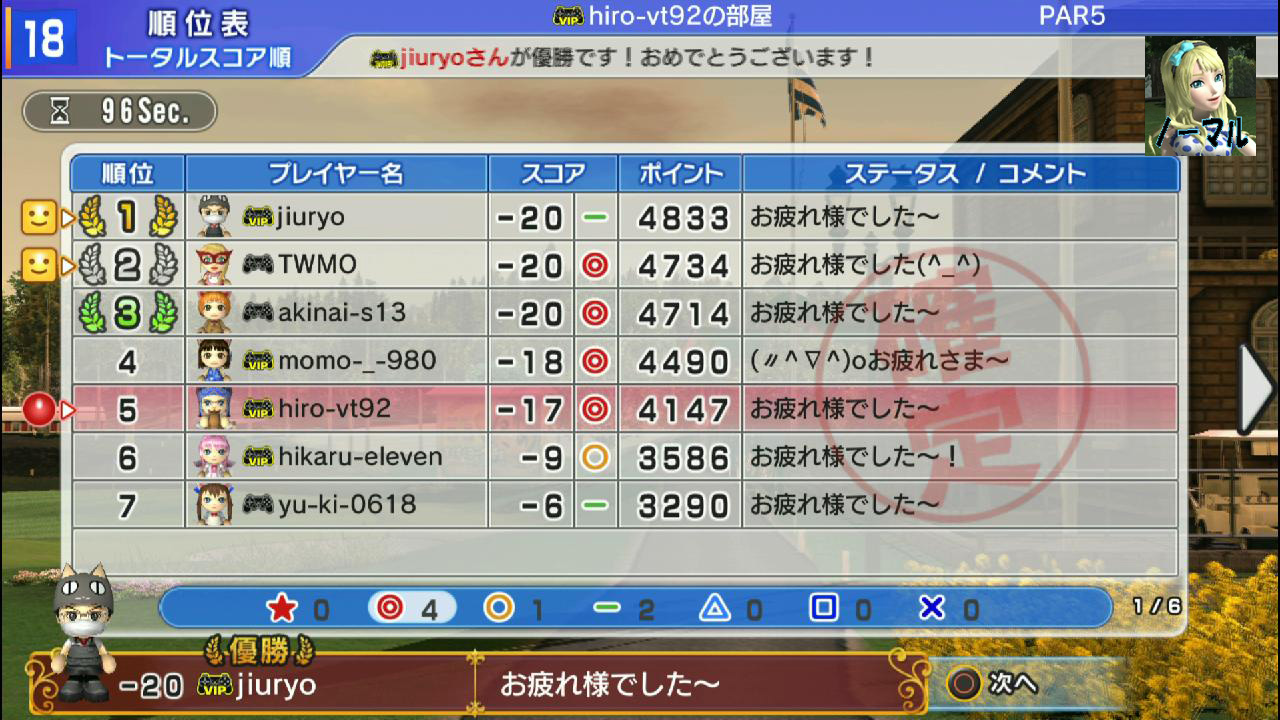 ひろうち92tトップ > みんゴル日誌 > みんゴル6 > 対戦部屋記録 2015年7月27日号