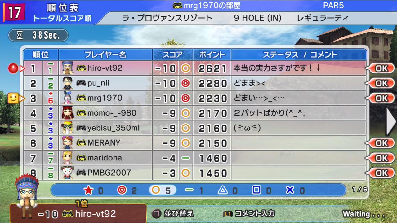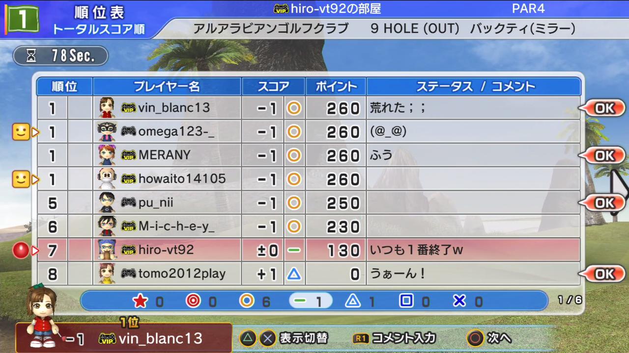 7番ホールの状態から順位は変わらず、まほろさんとメラニーさん、ひろうち92t、