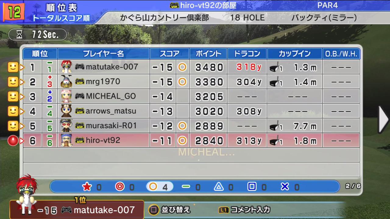 むらさきさんを除く全員がイーグルで上がり、ハイレベルな試合展開になっています。