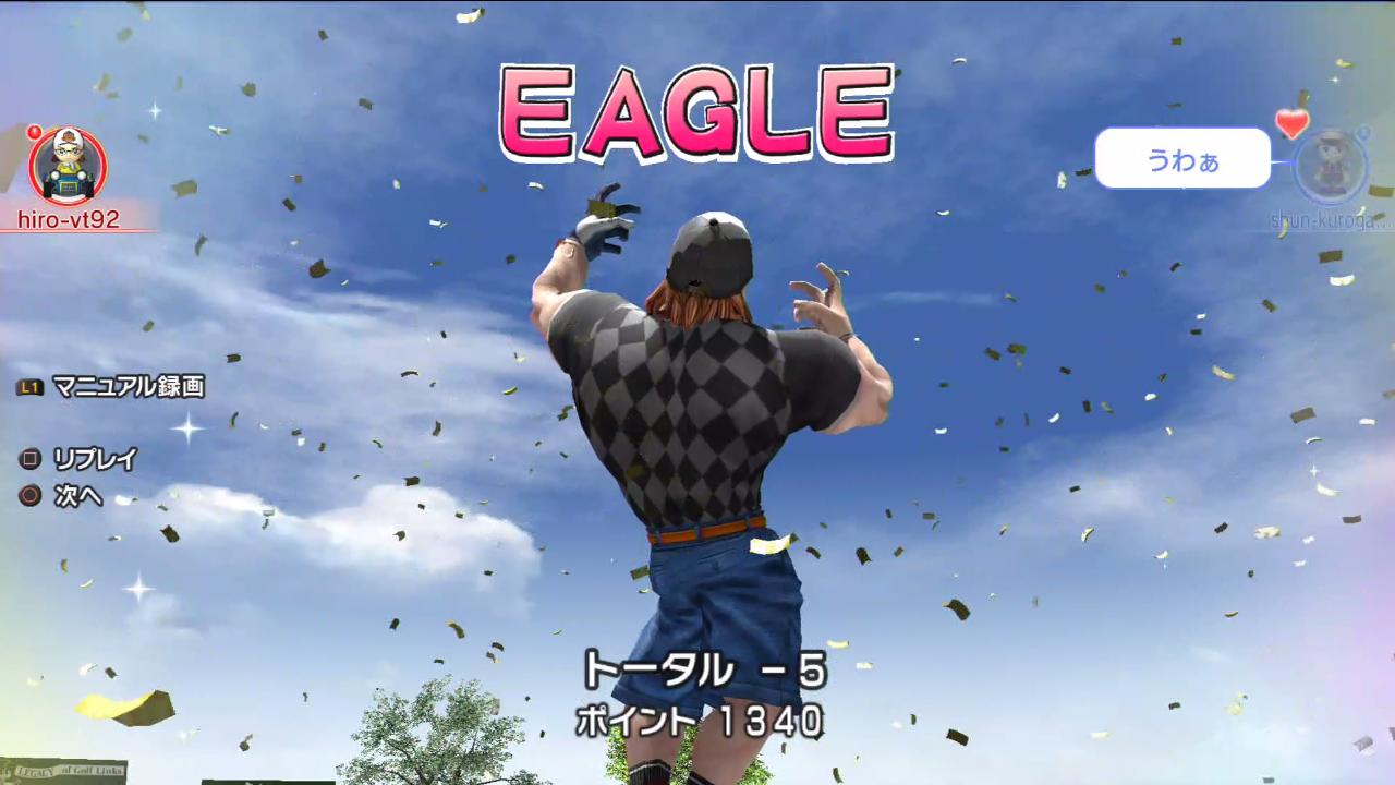 カップ位置は奥で非力なキャラでは結構寄せるのが難しい位置でしたが、全員がイーグルで