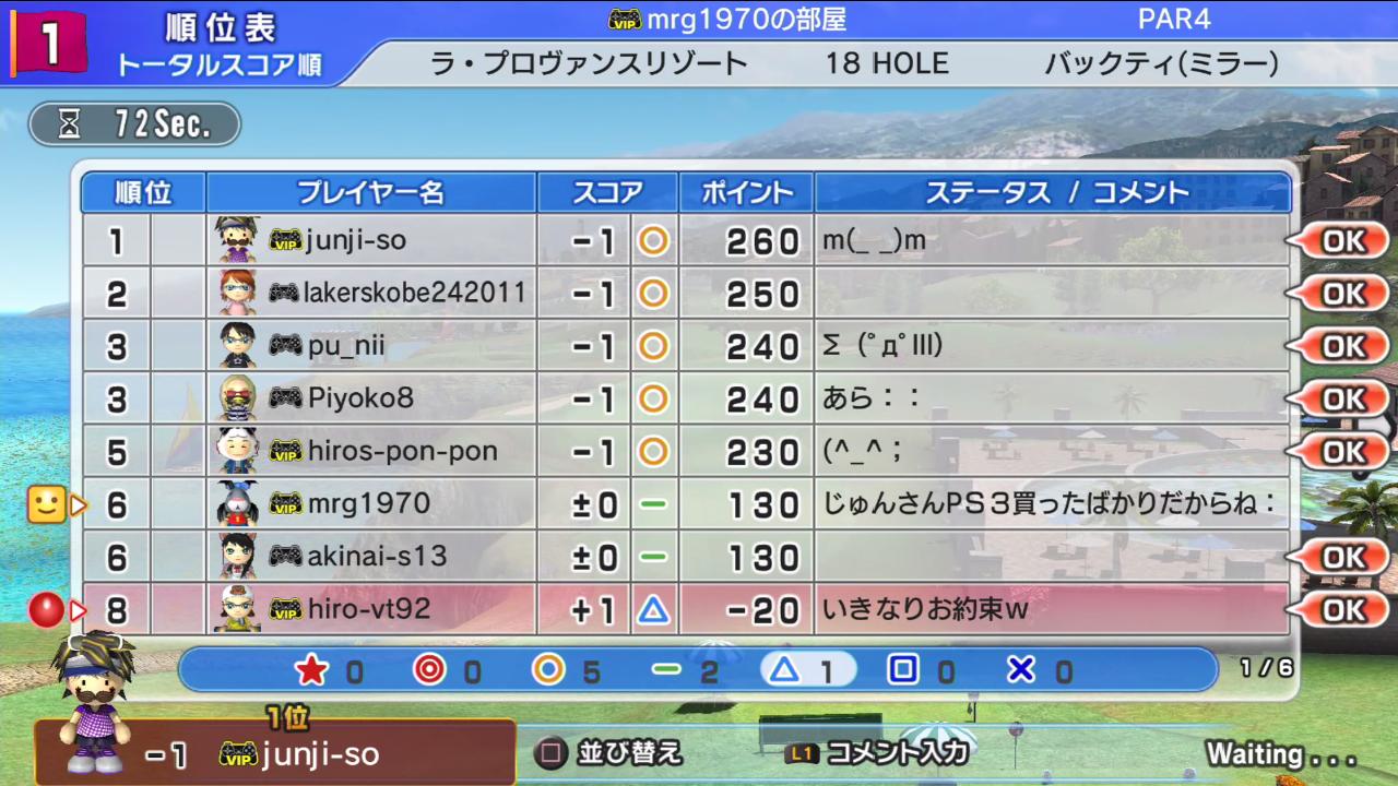 さすがに皆さんやり込んでるためか悪くてもバーディに留まっています。