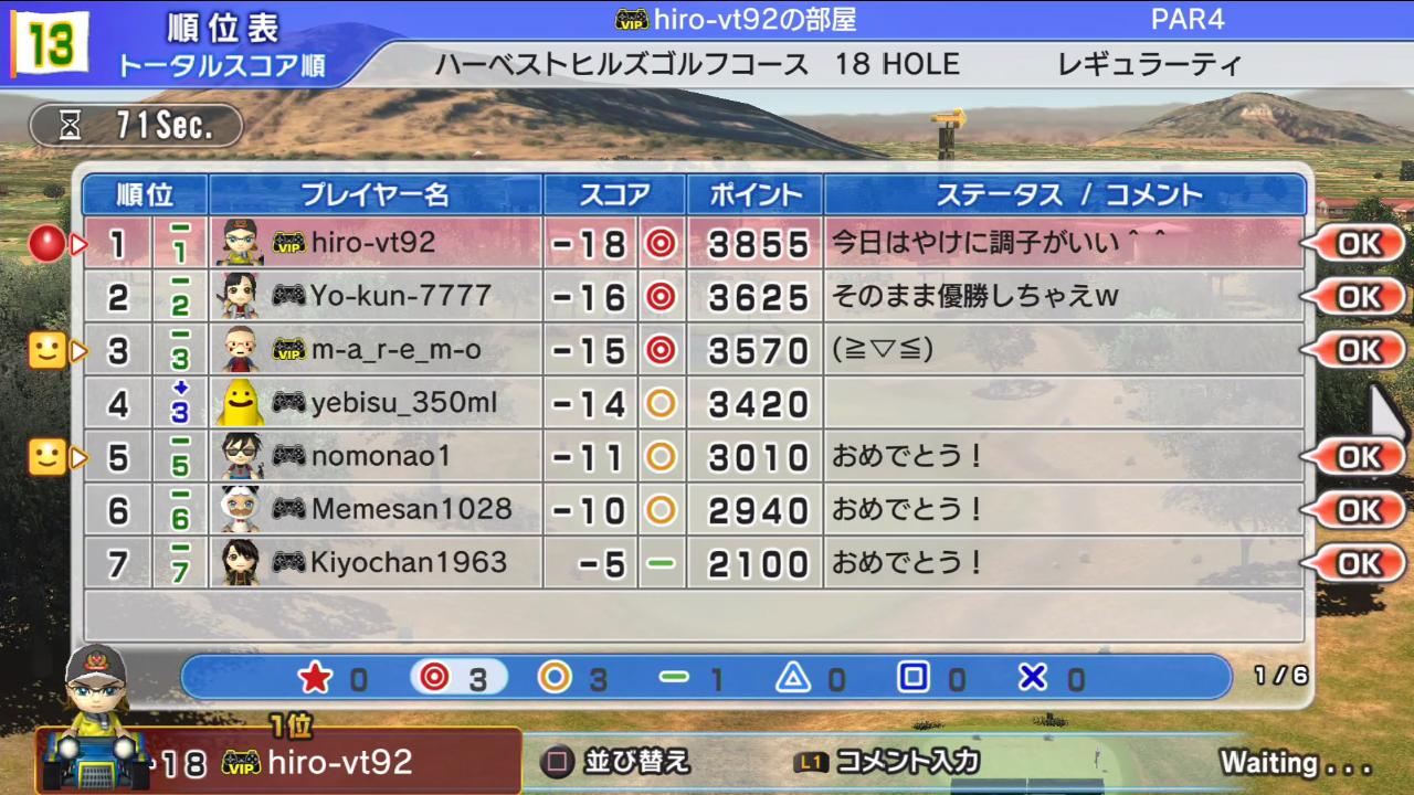 結果は1位えびちゃん(−6)、2位しゅんY12さん(−5)、3位ひろうち92t(−4)。