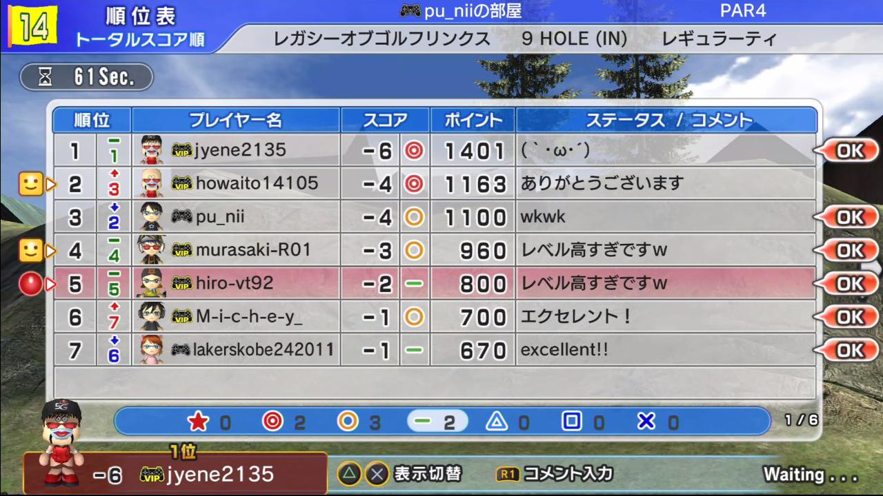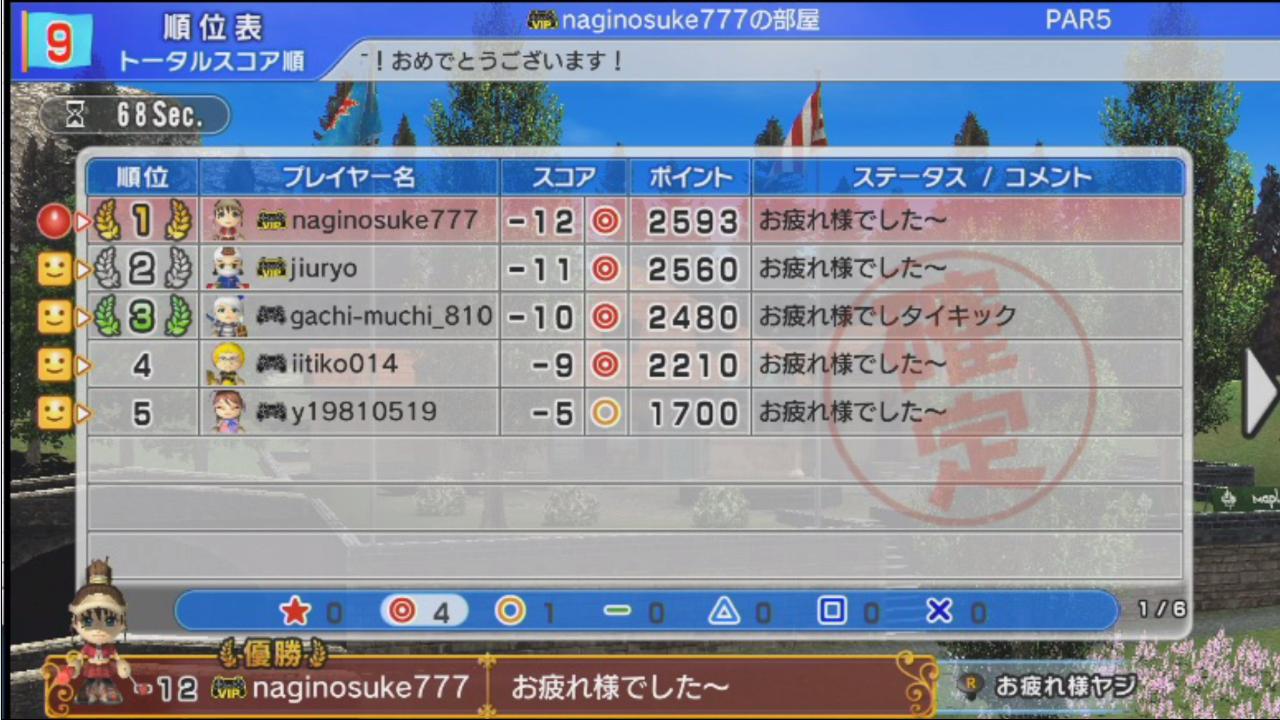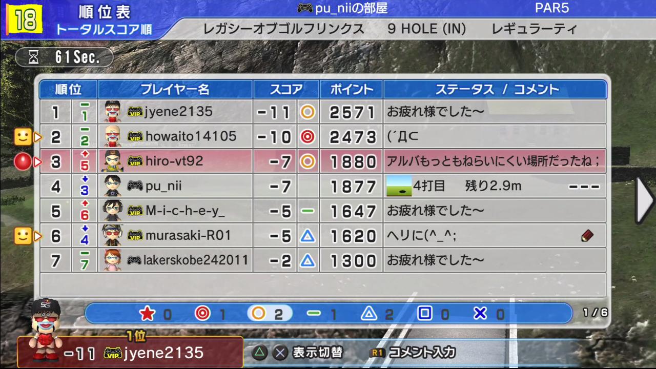 ぷに部屋では全部で4人がイーグルに成功しており、スコアの良さを物語っていますが、