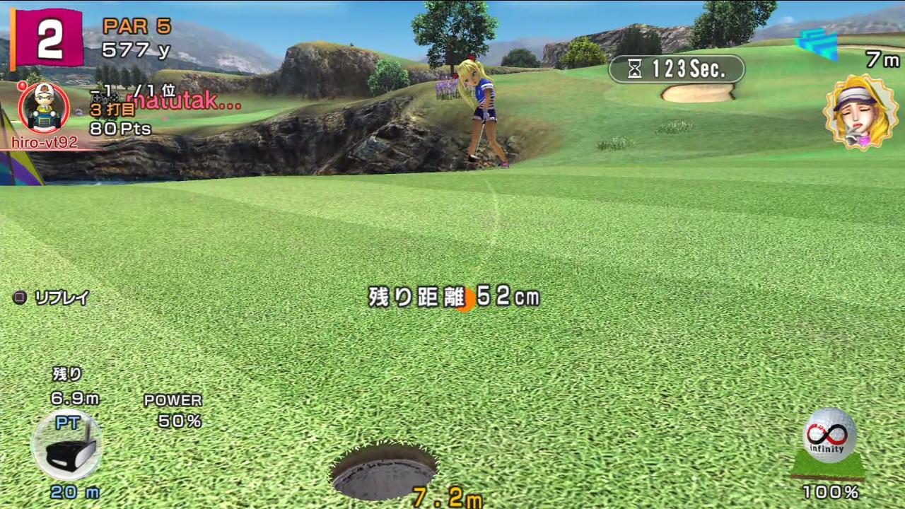 2打ともウサギやカメで外しつつも、奇しくもオンしたことと運良くロングパットが