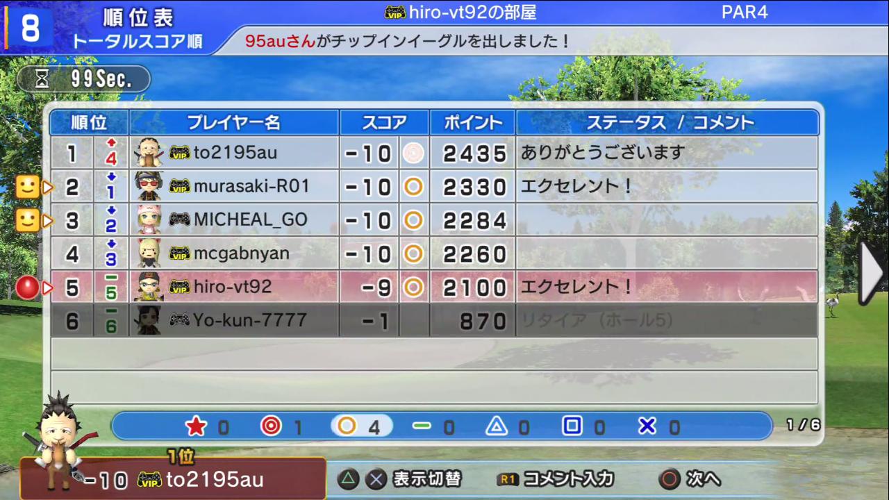 ひろうち92tトップ > みんゴル日誌 > みんゴル6 > 対戦部屋記録 2017年8月21日号